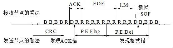 第2类:在ACK及分界符后到EOF第3位间有局部错时,例如CRC受干扰回读错、CRCDel回读错、EOF1\2\3回读错时,该节点所发(P.E.Flag)的6个R会被接收节点认为是正常的发送帧结尾EOF部分和2位服务间隔(I.M.)。别的节点所发新帧开始位(SOF),将落入发送节点消极报错帧分界符(P.E.Del)内,形成新错(图1)。如果别的节点所发新帧传送中未发生新错,该消极报错发送节点就见不到6个连续的相同位,它等待的6个连续的相同位将在别的节点所发新帧的ACK位后开始,它期待的(P.E.Del)将延续到别的节点所发新帧结束之后,所以只要有挂起待发帧,这种出错状态就重复下去。