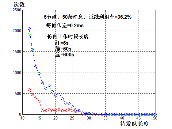 在消极报错状态的发送节点遇到16次重复错后,会进入真正离线状态,所以要求取有16帧挂起待发的概率。这与ECU的设计有关,较难分析。我们以仿真来求取(程序见附录),底盘CAN总线系统内一般有6个节点,约有60个左右的消息要传送,则每个节点平均有10条消息,假定周期为10、20、50、100、1000ms等各有2条,每条帧长为97bit,加上填充位,大约100bit,在500kbps时传送1帧大约0.2ms。6个节点的总线负载率总计43.4%。当一个节点等效离线后,还有5个节点约50条消息要发,总线负载率总计36.2%。在时钟差的影响下,可以构成一个峰值,节点在相对频差-0.2、0.4、0.6、0.8*100ppm下的仿真结果见图3。其中队列长度每0.2ms统计一次(送完1帧),累计出该队列长在整个仿真时间内的出现次数。为了便于ECU编程,采样与写CAN控制器在一个任务中完成,所以假定10条消息在4ms内就绪。仿真开始时是最坏情况:所有节点同时开始写CAN控制器任务。有初始相位差时,可能会经过较长时间(最小公倍数)达到消除初始相位差影响,但总是存在这样一个所有节点同时要求发送的最坏情况。在上述频差下,节点1、2经500s差10ms,也就是说二个节点的10ms周期的消息就绪时间又重合了,其它节点与节点1的组合各为250s、166s、125s又重合了。由于较长周期消息对挂起队长的影响较小,所以仿真的时段取得较短。以600s的结果计算,挂起长度为16以上的情况有3590次,占600秒内传送的总次数的比率为1.2*10-3。需要特别注意的是,挂起队长的分布不是均匀的,因此处于等效离线而转为真正离线的机会也不是均匀分布的。由上述仿真60s、600s的结果看,挂起长度为16以上的情况都是3590次,如果在最坏情况60s内遇上了的机会便是1.2*10-2。如果在最坏情况6s内遇上挂起长度为16以上的情况有1005次,机会便是3.3*10-2。