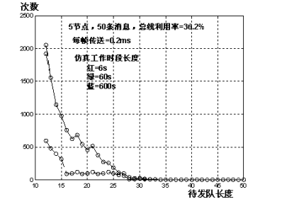 图中队列长度18的出现数比队列长度17次的多,可以由下解释:虽然每个18队都要经过17队而下降,但是处于18队时仍可能增长到19队或更长,它们退下时又要经过18队状态。而在某时,由于同时就绪的消息多于2个,所以使队长度直接由小于17而跳到18,从而使18队的出现次数多于17队。