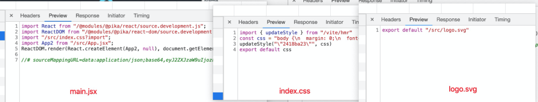 从上图可以看到,已经不再有一个构建好的 bundle、chunk 之类的文件,而是直接加载本地对应的文件。