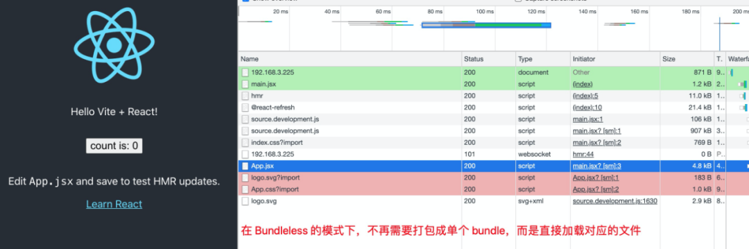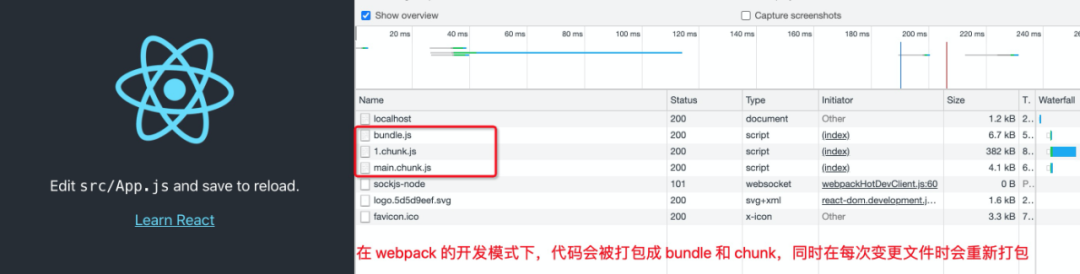 下面以大家最熟悉的 create-react-app 默认项目为例,从实际的页面渲染资源的加载过程对比 Bundle 和 Bundleless 的区别。