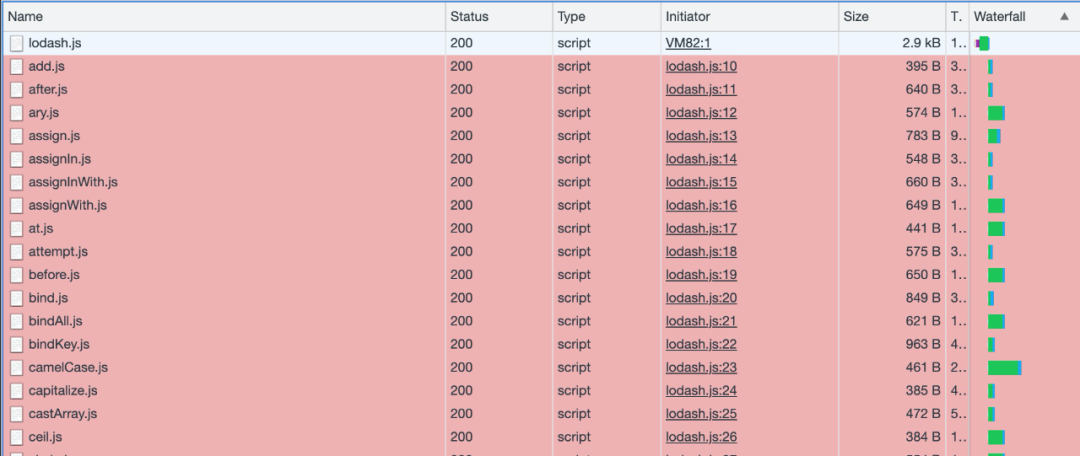 Bundleless 的模式不再打包,提升了启动的速度,但对于一些有较多外部依赖或者自身文件数量较多的模块,需要发起大量请求才能获取到全部的资源,这个会降低开发过程中页面加载的时间。比如下面是直接在浏览器中 import lodash-es 会并发出大量的请求: