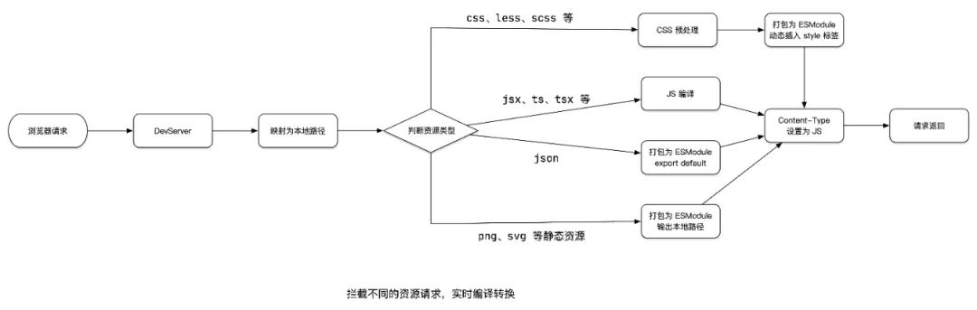 而浏览器在处理文件时是依据 Content-Type 的,不关心具体的文件类型,所以我们需要在浏览器发起请求时,将对应的资源转化为 ESModule 格式,同时设置对应的 Content-Type 为 JS,返回给浏览器执行,浏览器就会按照 JS 的语法进行解析处理,整体的流程可见下图: