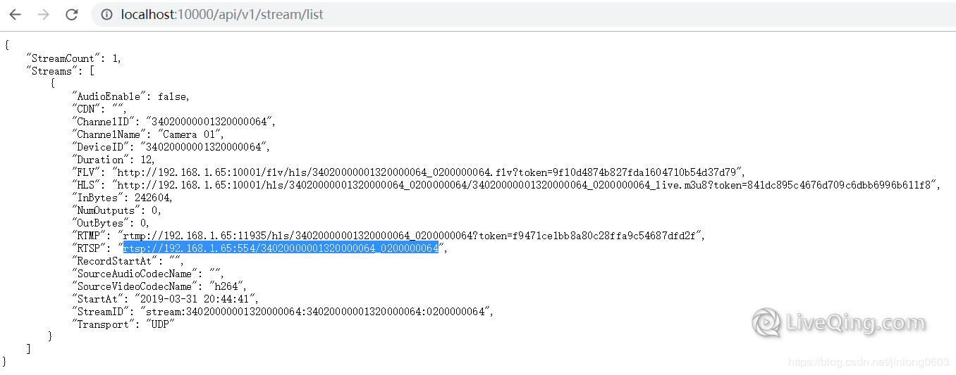 拉取一路直播流, 通过接口 /api/v1/stream/list 可以查看流信息, 其中包含了这一路直播流的 RTSP 流地址, 如图