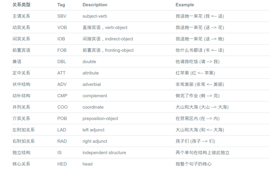 依存语法 (Dependency Parsing, DP) 通过分析语言单位内成分之间的依存关系揭示其句法结构。 直观来讲,依存句法分析识别句子中的“主谓宾”、“定状补”这些语法成分,并分析各成分之间的关系