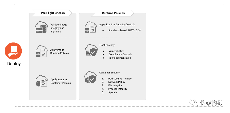 在开发和发布过程中集成的安全性能够对候选工作负载的属性进行实时的持续的验证(例如制品签名的验证、容器镜像和运行时的安全策略等)。随安全的工作负载同时部署的可观察性支持,提供了对日志和指标的支持,进一步完善了安全保障的覆盖面积。