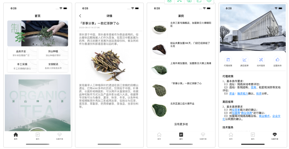 从上面的企业app开发效果图中我们可以看到”加盟代理“页面隐藏了导航栏,而其它页面没有隐藏。”加盟代理“页面路径为 pages/join/join.stml,我们参照微信小程序的语法,在同目录下放置了 join.json 文件,在里面配置 navigationStyle 字段为 custom。