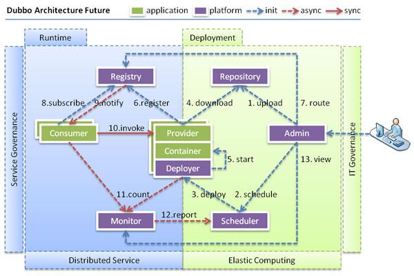 当服务集群规模进一步扩大,带动IT治理结构进一步升级,需要实现动态部署,进行流动计算,现有分布式服务架构不会带来阻力。下图是未来可能的一种架构:
