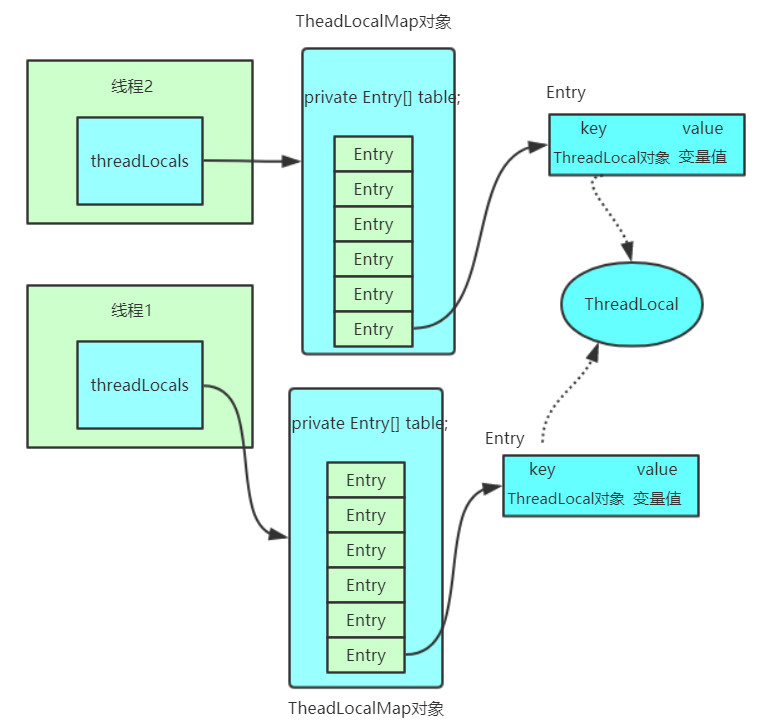 ThreadLocalMap 里的Entry对象的key就是ThreadLocal对象本身,value就是变量的值。当我们获取变量值得时候,首先可以通过Thread.currentThread()获取到当前线程对象,然后获取线程内部的ThreadLocalMap对象,然后调用ThreadLocalMap 的get方法就可以获取到值。同理设置值也是最后转换为对线程内部的ThreadLocalMap 的操作。