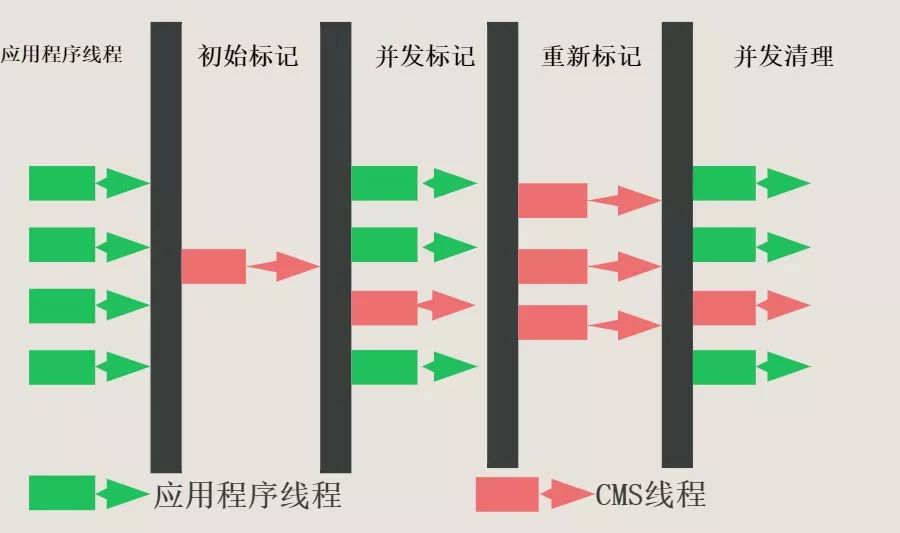 从上图可以看到标记过程分三步:初始标记、并发标记、重新标记。并发标记是最主要的标记过程,而这个过程是并发执行的,可以与应用程序线程同时进行,初始标记和重新标记虽然不能和应用程序并发执行,但这两个过程标记速度快,时间短,所以对应用程序不会产生太大的影响。最后并发清除的过程,也是和应用程序同时进行的,避免了应用程序的停顿。