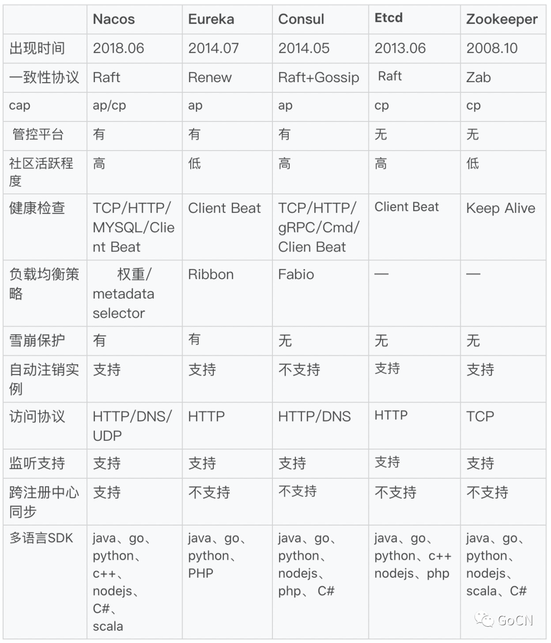 生态:各注册中心对Go语言都有支持,但是Nacos、 Consul、Etcd 社区活跃,zookeeper和Eureka社区活跃度较低;