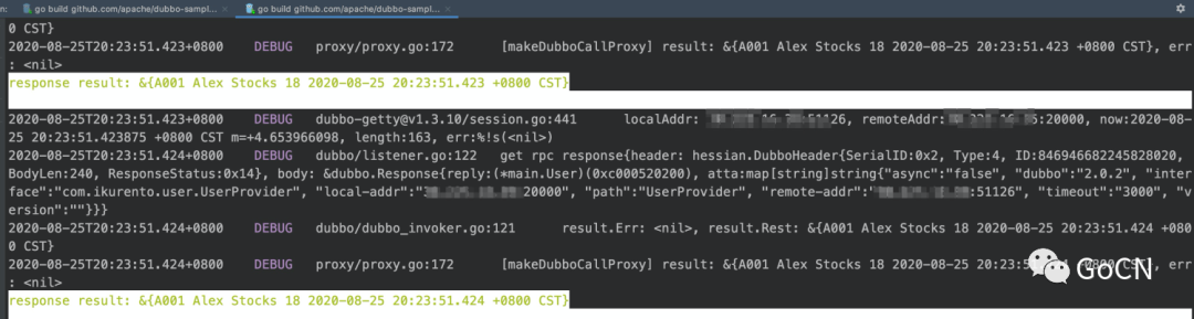 进入registry/servicediscovery/nacos/go-client/app,运行client.go的main方法,看到如下日志输出,表示调用server端成功。