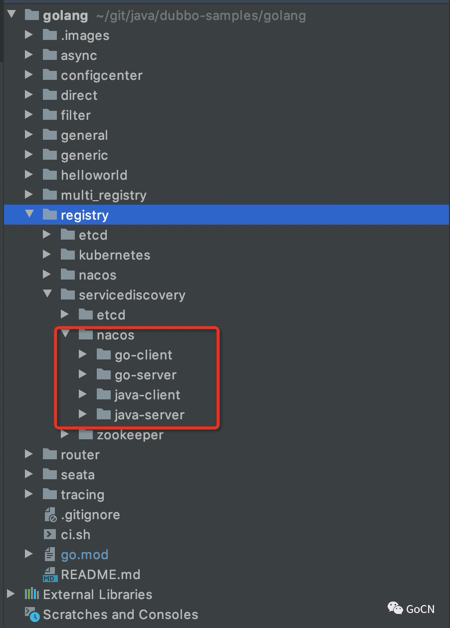 dubbo-go samples代码下载:https://github.com/apache/dubbo-samples/tree/master/golang,基于Nacos注册中心的应用级服务发现的hello world代码目录在registry/servicediscovery/nacos。