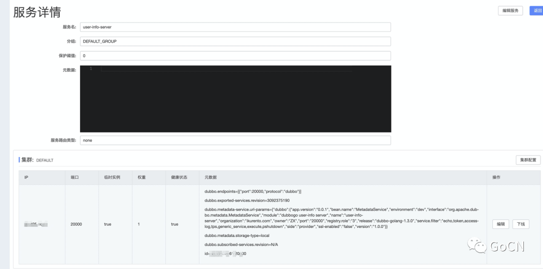 进入registry/servicediscovery/nacos/go-server/app,运行server.go的main方法,可以从Nacos的控制台(http://console.nacos.io/nacos/#/serviceManagement?dataId=&group=&appName=&namespace=)看到,应用user-info-server已经注册成功。
