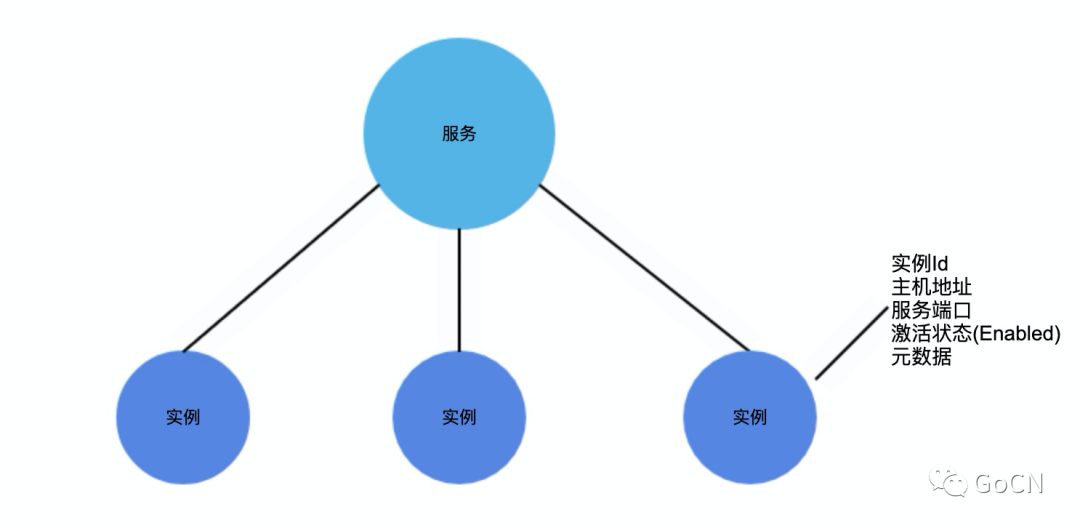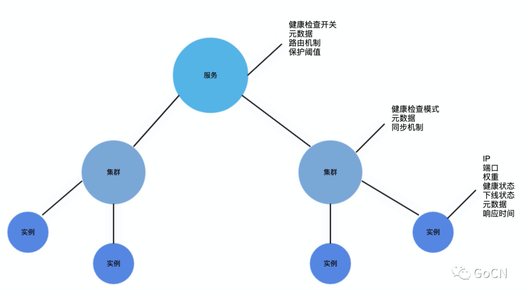 图3是我们Dubbo-go的应用维度服务发现模型,主要有服务和实例两个层级关系,服务实例的属性主要包含实例Id、主机地址、服务端口、激活状态和元数据。图4为Nacos的服务分级存储模型,包含服务、集群和实例三个层次。两者对比,多了一个集群维度的层级,而且实例属性信息能够完全匹配。所以在Dubbo-go将应用服务实例注册到Nacos时,我们只需要将集群设置为默认集群,再填充服务和实例的相关属性,即可完成服务模型上的匹配。此外Nacos可以将服务注册到不同的Namespace下,实现多租户的隔离。