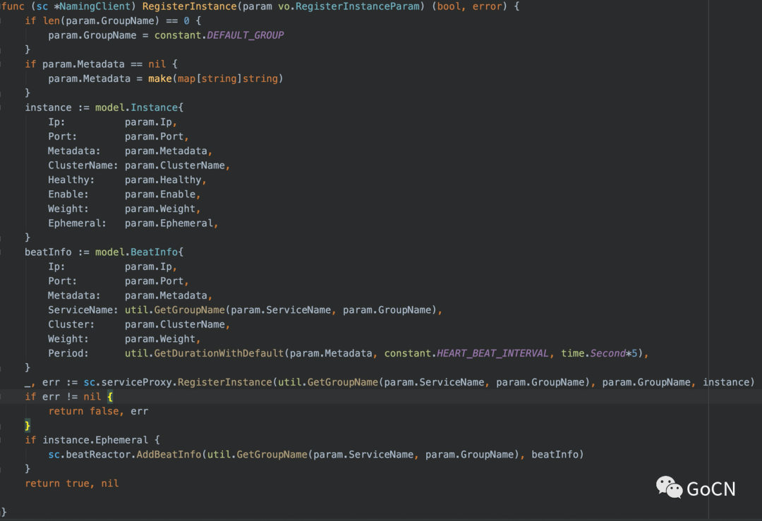 Dubbo-go的Provider在向Nacos注册应用服务实例信息后,需要主动上报心跳,让Nacos服务端感知实例的存活与否,以判断是否将该节点从实例列表中移除。维护心跳的工作是在Nacos-SDK-go完成的,从图5代码中可以看到,当Dubbo-go调用RegisterInstance注册一个服务实例时,SDK除了调用Nacos的Register API之外,还会调用AddBeatInfo,将服务实例信息添加到本地缓存,通过后台协程定期向Nacos发送服务实例信息,保持心跳。当服务下线时,可以通过调用DeRegisterInstance执行反注册,并移除本地的心跳保持任务,Nacos实例列表中也会将该实例移除。