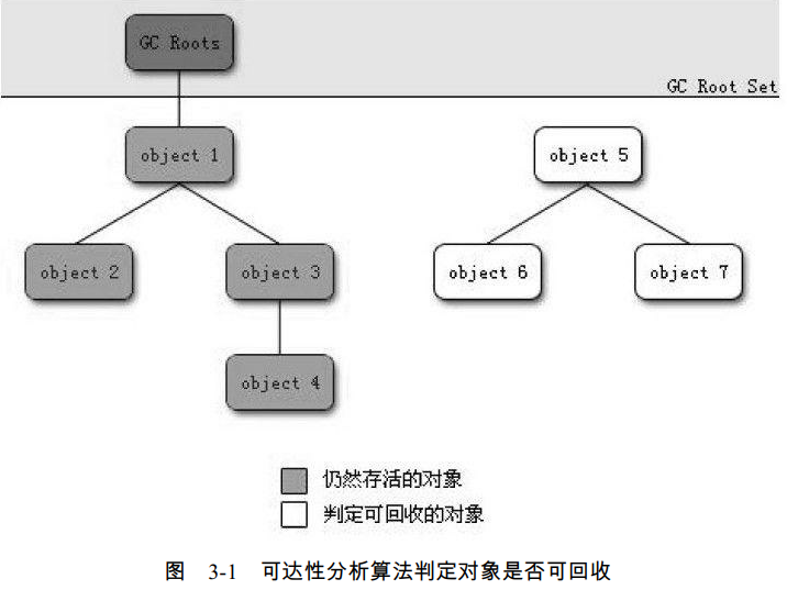 在主流的商用程序语言( Java、 C#, 甚至包括前面提到的古老的Lisp) 的主流实现中,都是称通过可达性分析( Reachability Analysis) 来判定对象是否存活的。 这个算法的基本思路就是通过一系列的称为“GC Roots”的对象作为起始点, 从这些节点开始向下搜索, 搜索所走过的路径称为引用链( Reference Chain) , 当一个对象到GC Roots没有任何引用链相连( 用图论的话来说, 就是从GC Roots到这个对象不可达) 时, 则证明此对象是不可用的。 如图3-1所示, 对象object 5、 object 6、 object 7虽然互相有关联, 但是它们到GC Roots是不可达的, 所以它们将会被判定为是可回收的对象。