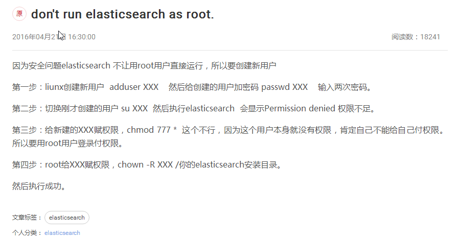 1、 直接bin文件夹下执行elasticsearch命令启动时,提示不能用root用户启动(don't run elasticsearch as root),原因.root超级用户不能正常启动