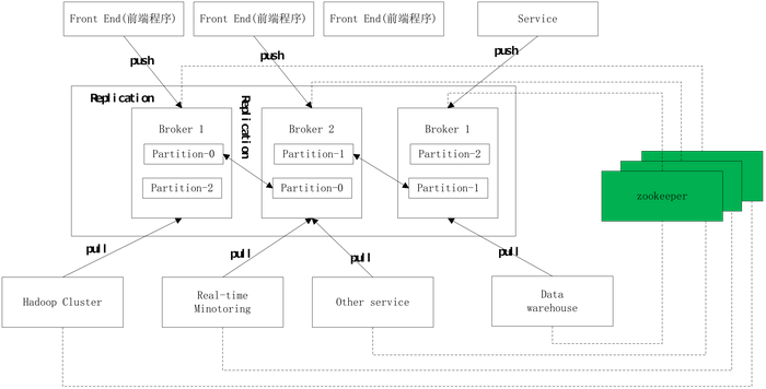 备份(Replication):为了保证分布式可靠性,kafka0.8开始对每个分区的数据进行备份(不同的Broker上),防止其中一个Broker宕机造成分区上的数据不可用。