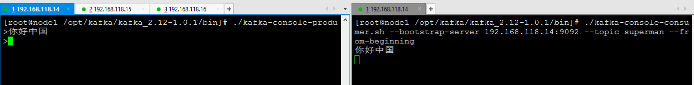 [root@node1 /opt/kafka/kafka_2.12-1.0.1/bin]# ./kafka-console-consumer.sh --bootstrap-server 192.168.118.14:9092 --topic superman --from-beginning