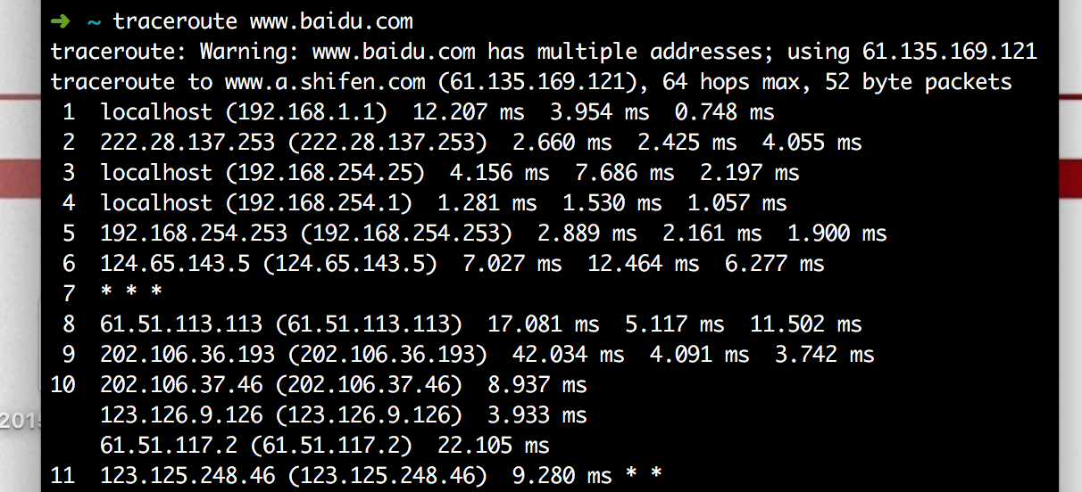 4、使用traceroute命令进行路由侦查,它会警告我们:www. baidu.com有多个地址;使用61.135.169121