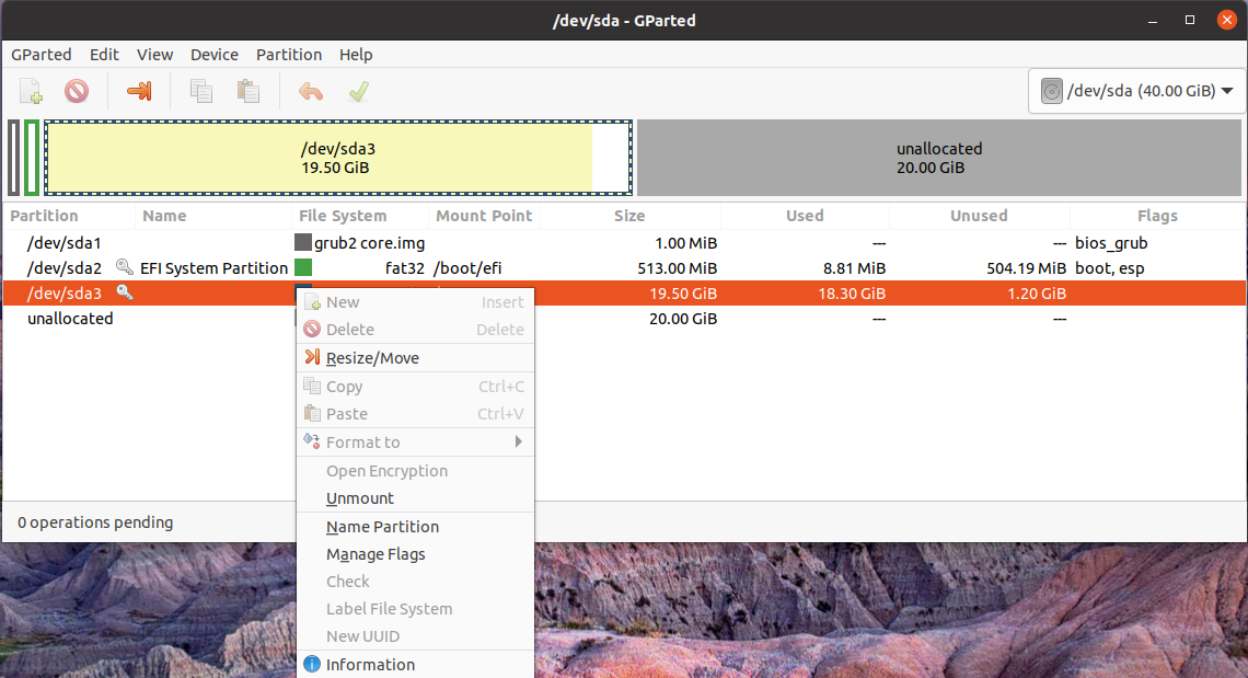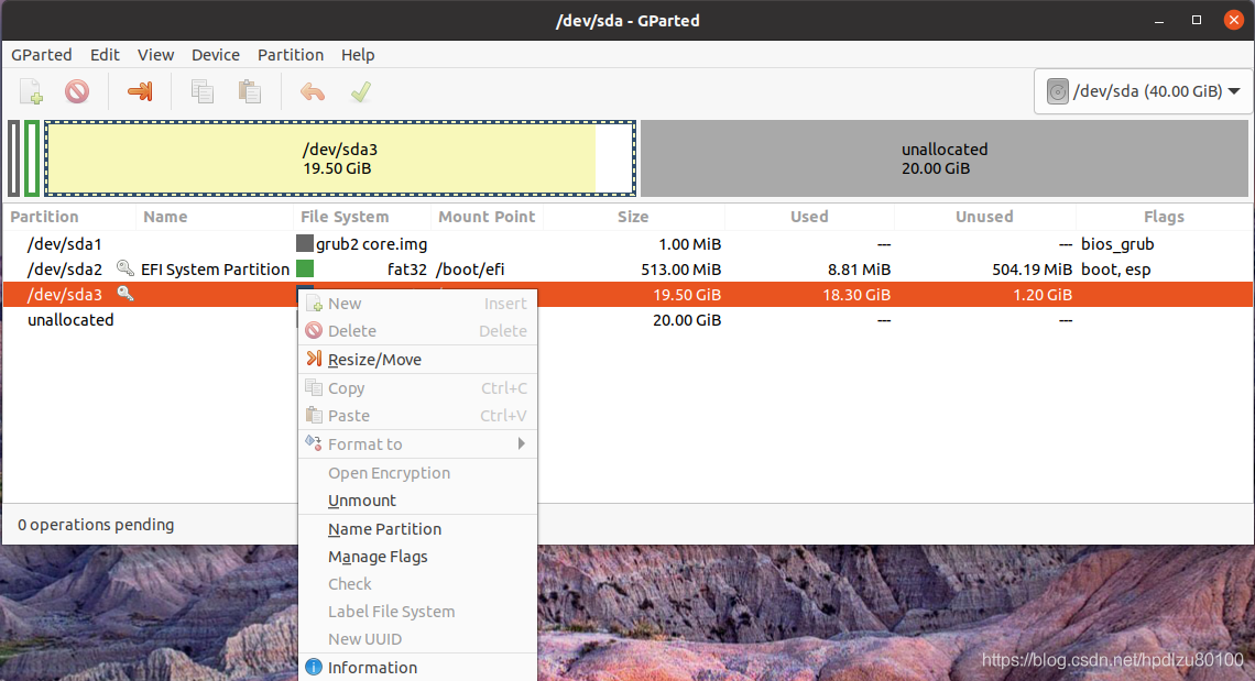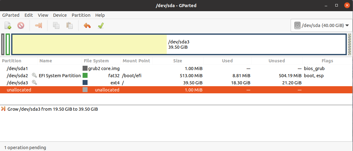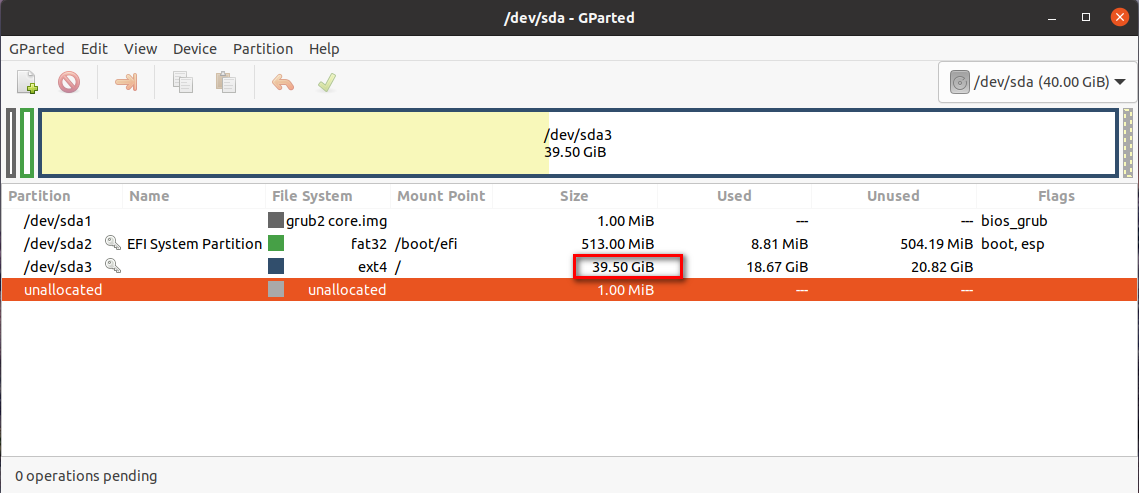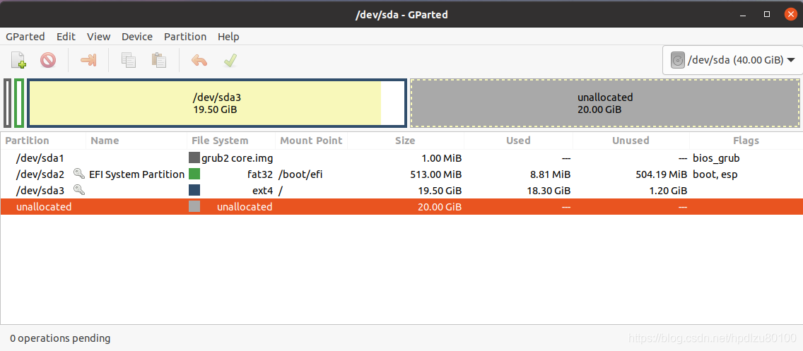 1. 打开GParted,发现未分配磁盘空间(此空间为在VMware中为Ubuntu磁盘扩增时指定的容量),主分区为sda3(文件系统为ext4)