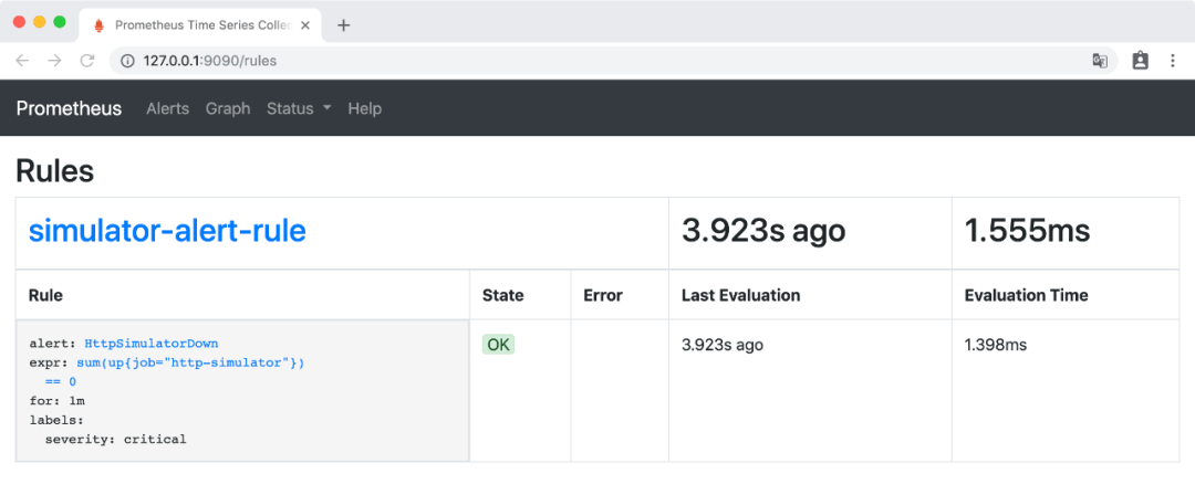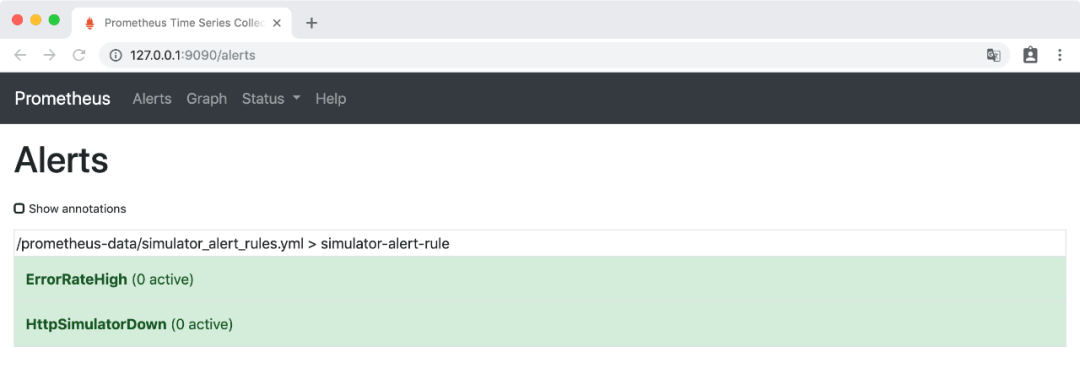 访问http://127.0.0.1:9090/alerts ,Alerts 下 HttpSimulatorDown 为绿色,处于INACTIVE 状态,表示什么都没有发生。
