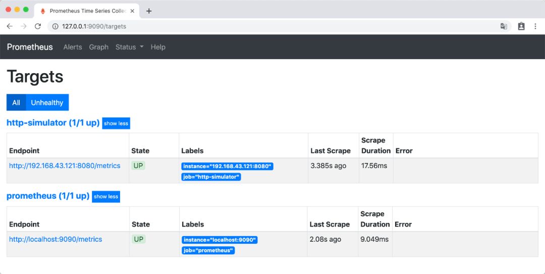 访问http://127.0.0.1:9090/targets ,Prometheus 自身的 metrics 和 http-simulator 的 metrics 处于up 状态 ,那么准备工作就做好了。