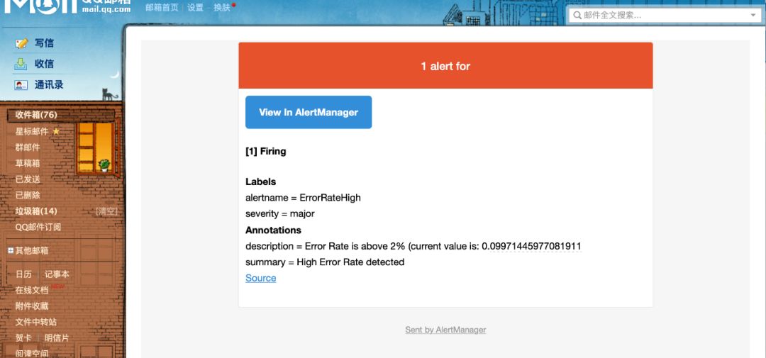 Alertmanager 主要用于接收 Prometheus 发送的告警信息,它很容易做到告警信息的去重,降噪,分组,策略路由,是一款前卫的告警通知系统。它支持丰富的告警通知渠道,可以将告警信息转发到邮箱、企业微信、钉钉等。这一节讲解利用AlertManager,把接受到的告警信息,转发到邮箱。