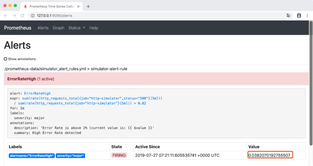 稍等一会后,访问http://127.0.0.1:9090/alerts, 可以看到错误率已经大2%,ErrorRateHigh 为红色的 FIRING 状态,报警已经被激活了。