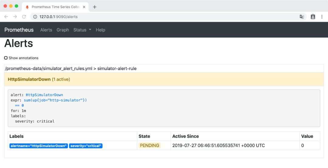 访问http://127.0.0.1:9090/alerts,HttpSimulatorDown 变成黄色,处于 PENDING 状态,表示报警即将被激活。