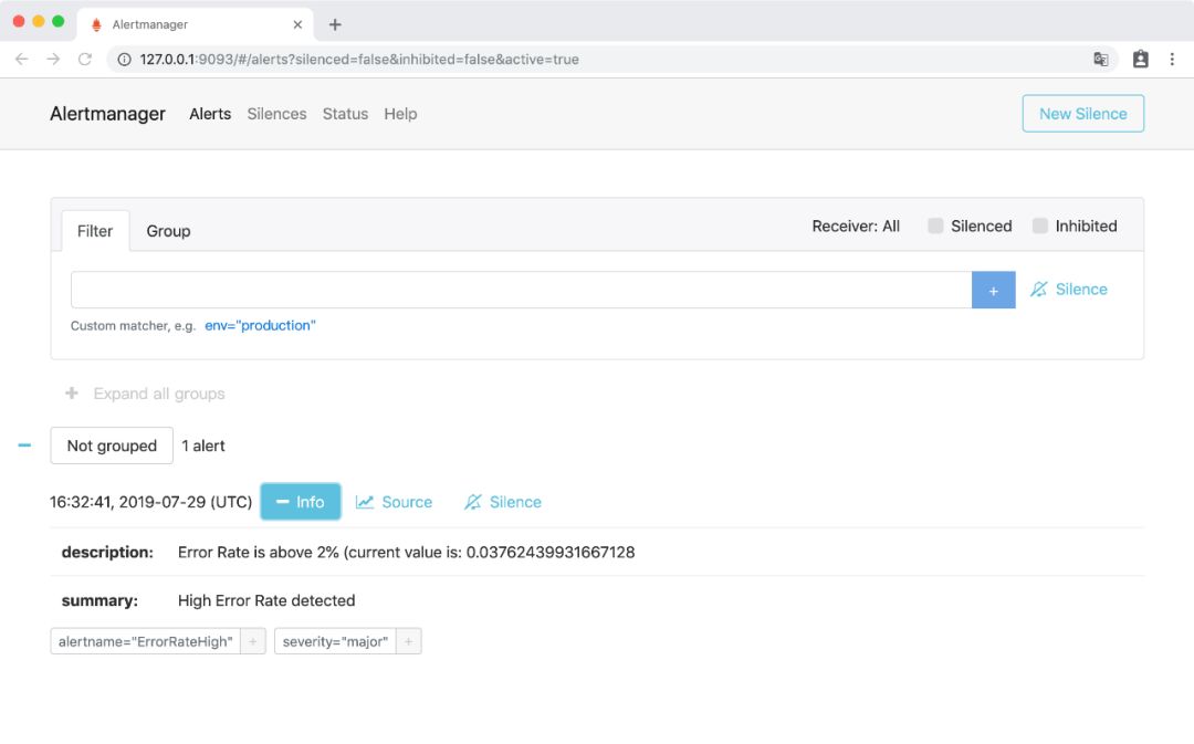访问http://127.0.0.1:9093,访问Alertmanager UI界面,可以看到接收到ErrorRateHigh告警: