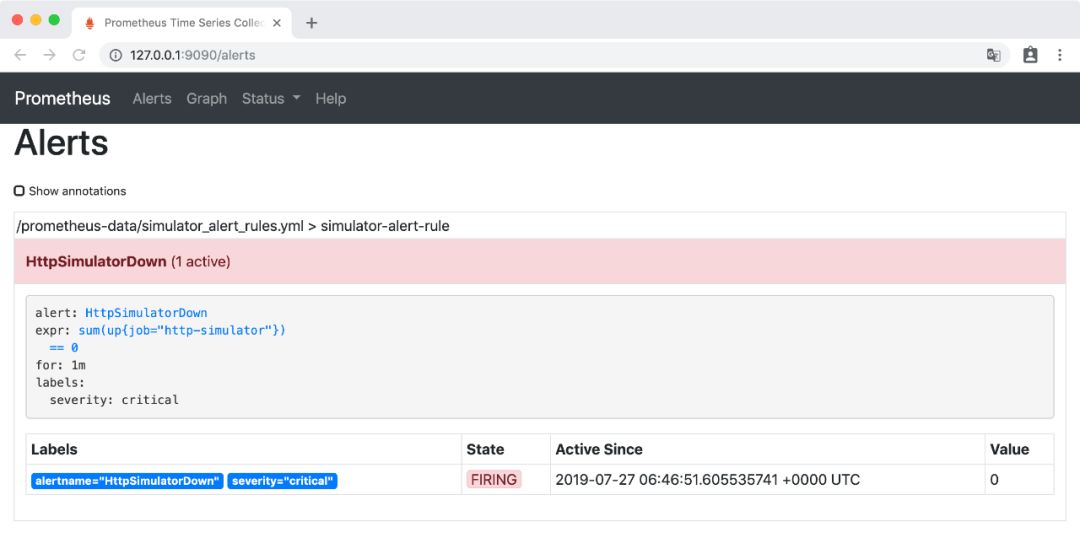 一分钟后,HttpSimulatorDown 变成红色,处于 FIRING 状态,表示报警已经被激活了。