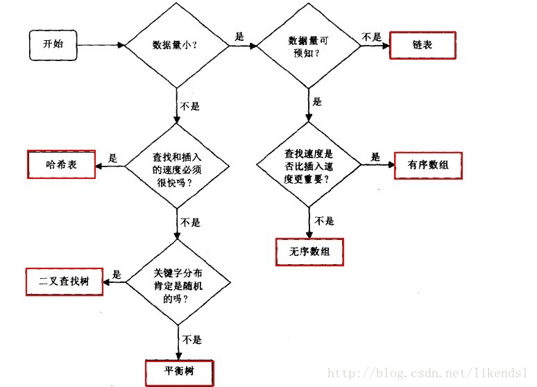 从上图我们可以清楚的了解什么样的数据选择什么样的结构。比如我们要在集合{1,2,3,4····10000}中查找整数n,那么链表最坏的情况下的时间复杂度为O(n),而二叉树(二叉树建立的合理矮胖矮胖的)则只需要O(lg n)。而数据量越来越大时二叉树表现得越好。
