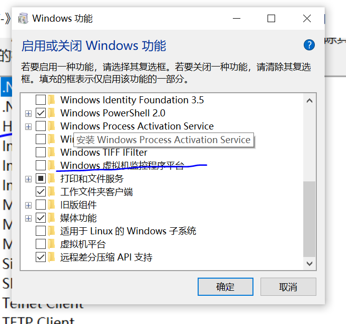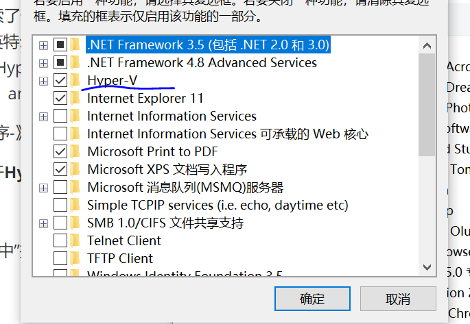 此时打开控制面板-》程序-》程序和功能-》启用或关闭Windows功能-》勾选Hyper-V和Windows虚拟机监控程序平台,如果能直接勾选就结束了hhh