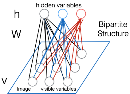 b.Restricted BoltzmannMachine(RBM) 玻耳兹曼机的定义:假设所有的节点都是随机二值变量节点(只能取0或者1值),同时假设其全概率分布p(v,h)满足Boltzmann分布;(Restricted在这里是指:这些网络被“限制”为一个可视层和一个隐层,层间存在连接,但层内的单元间不存在连接),隐层单元被训练去捕捉在可视层表现出来的高阶数据的相关性。