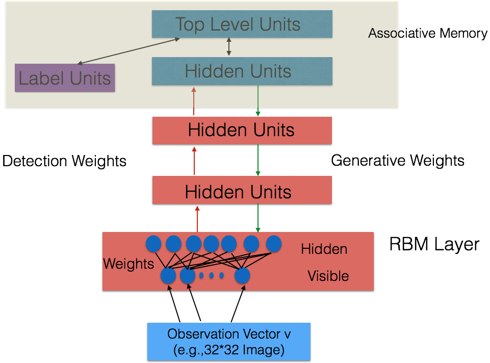 在最高两层,权值被连接到一起,这样更底层的输出将会提供一个参考的线索或者关联给顶层,这样顶层就会将其联系到它的记忆内容。而我们最关心的,是其最后的判别性能,例如分类任务里面。