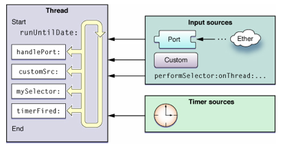 3. 输入源传递异步消息,通常来自于其他线程或者程序。定时源则传递同步消息,在特定时间或者一定的时间间隔发生