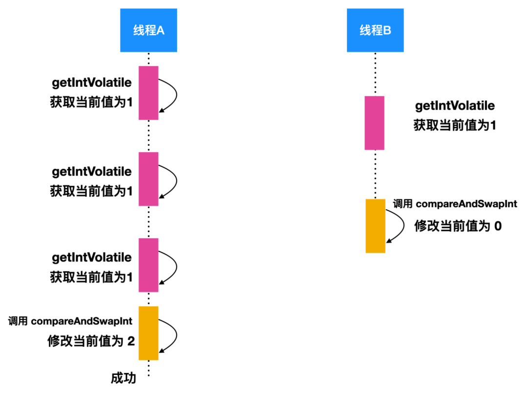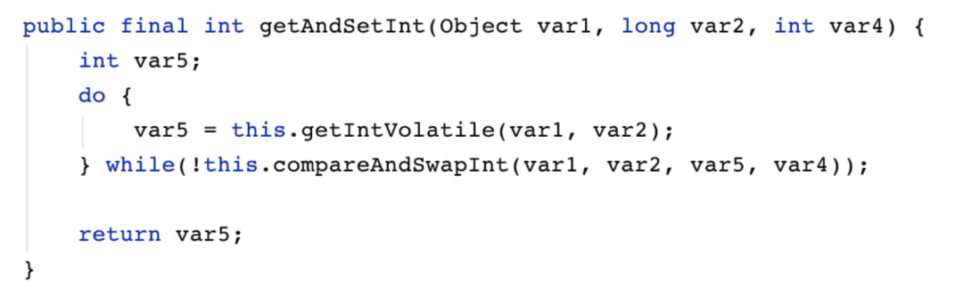 循环直到 compareAndSwapInt 返回 false,这就说明使用 CAS 并没有更新为新的值,所以 var5 返回的就是最新的内存值。