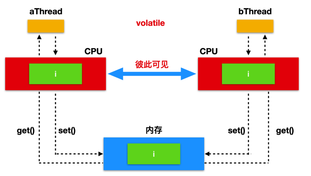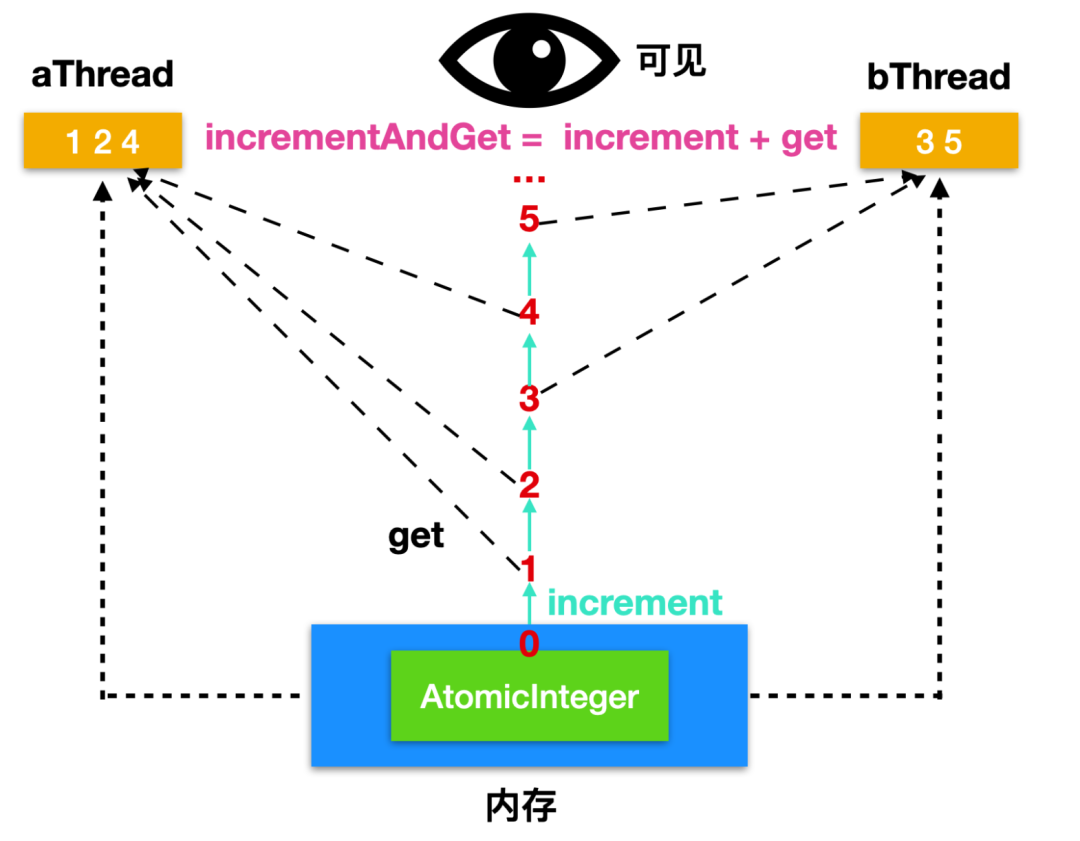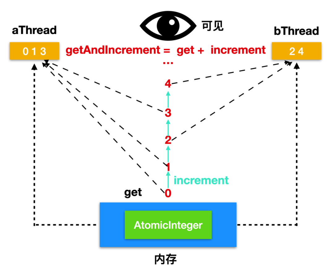 get() 可以原子性的读取 AtomicInteger 中的数据,set() 可以原子性的设置当前的值,因为 get() 和 set() 最终都是作用于 value 变量,而 value 是由 volatile 修饰的,所以 get 、set 相当于都是对内存进行读取和设置。如下图所示