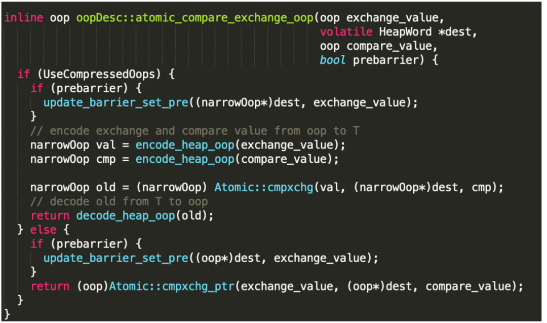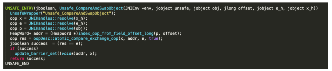 简单解释一下就是 UnsafeWrapper 就是包装器,换个名字而已。然后经过一些 JNI 的处理,因为 compareAndSwapOject 比较的是引用,所以需要经过 C++ 面向对象的转换。最主要的方法是 atomic_compare_exchange_oop