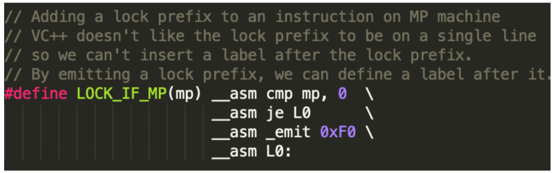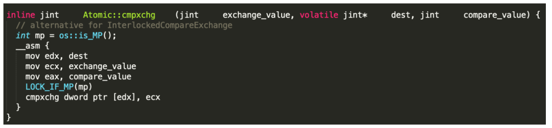 上面的 os::is-MP() 是多处理操作系统的接口,下面是 __asm ,它是 C/C++ 的关键字,用于调用内联汇编程序。