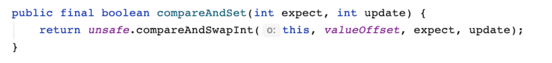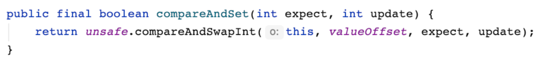 上面给出了 CAS Java 层面的源码,JDK 官方给它的解释就是 「如果当前值等于 expect 的值,那么就以原子性的方式将当前值设置为 update 给定值」,这个方法会返回一个 boolean 类型,如果是 true 就表示比较并更新成功,否则表示失败。