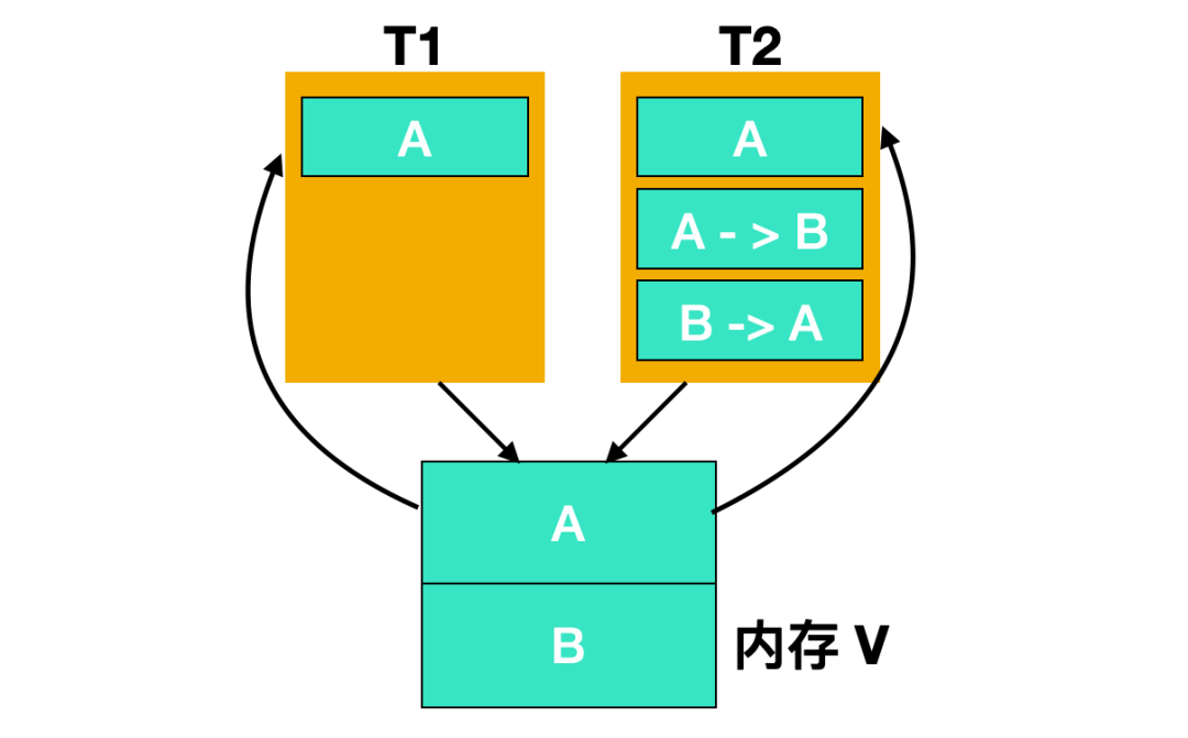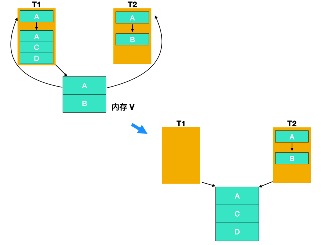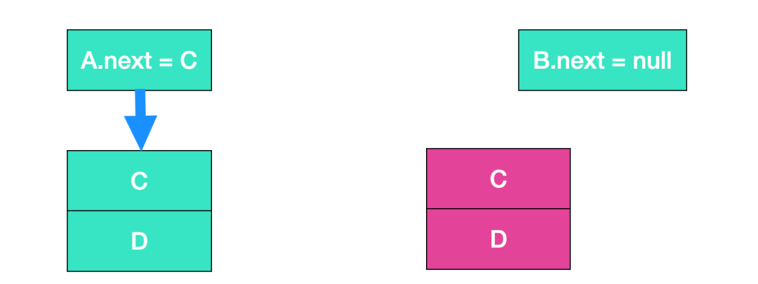 此时 T2,发现内存值还是 A ,就会把 A 的值尝试替换为 B ,因为 B 的引用是 null,此时就会造成 C、D 处于游离态