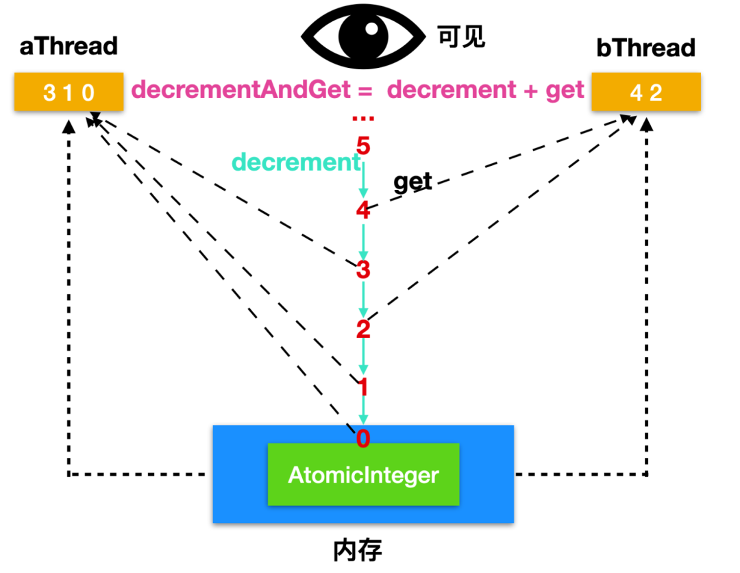 decrementAndGet:同样的,decrementAndGet 方法就是先执行递减操作,然后再获取 value 的值,示意图如下