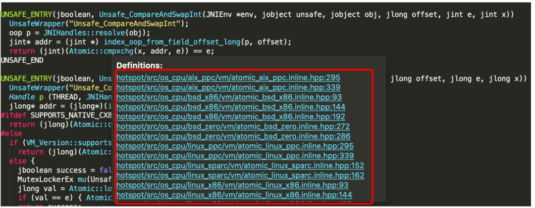 可以看到,又出现了熟悉的词汇 cmpxchg,也就是说 compareAndSwapOject 使用的还是 cmpxchg 原子性指令,只是它经过了一系列转换。