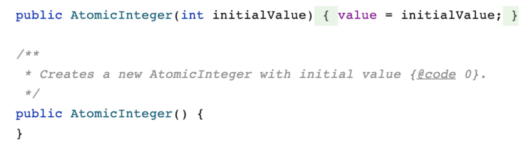 继续往下看,AtomicInteger 的构造方法只有两个,一个是无参数的构造方法,无参数的构造方法默认的 value 初始值是 0 ,带参数的构造方法可以指定初始值。