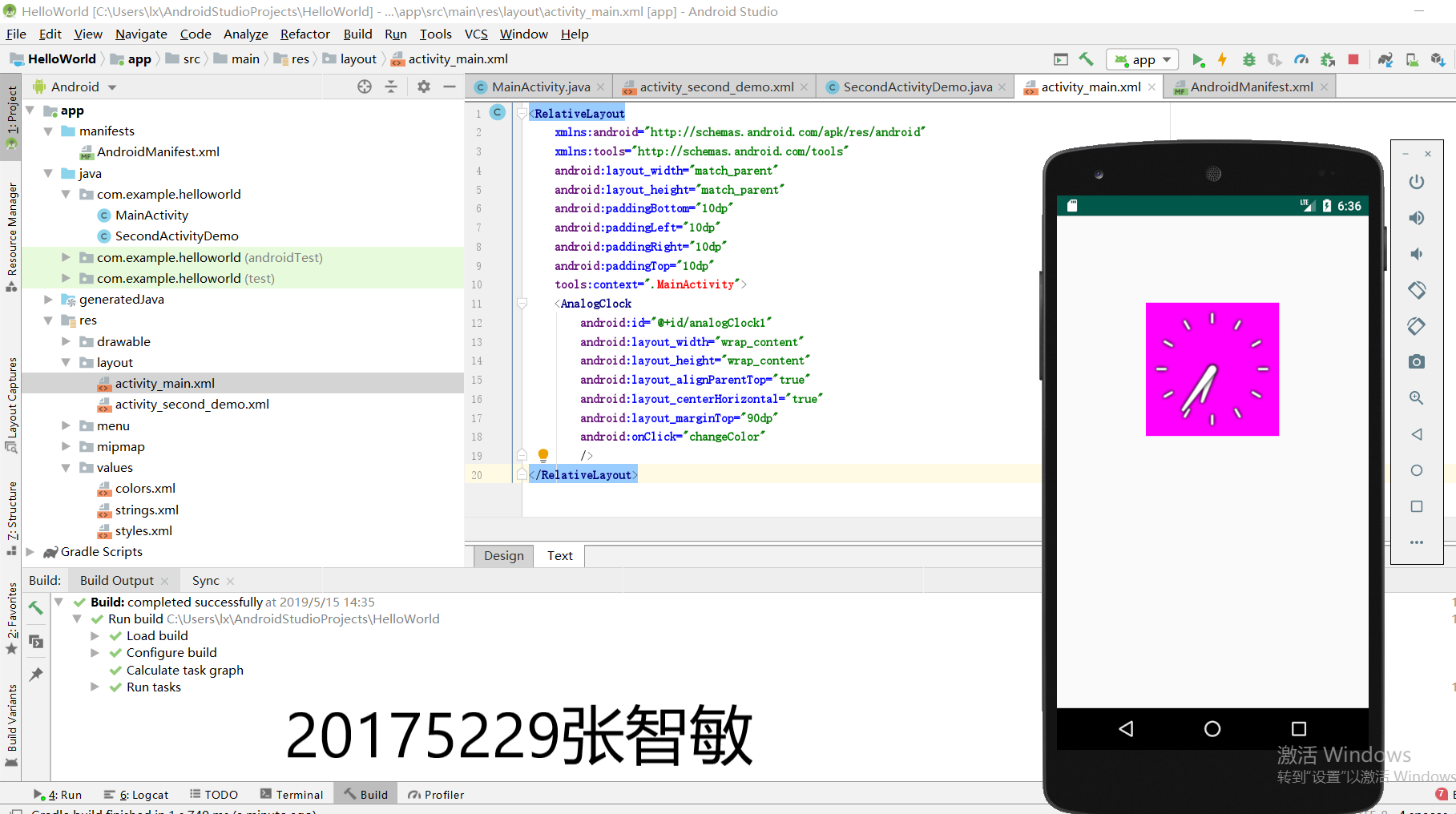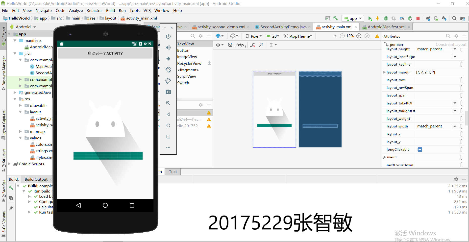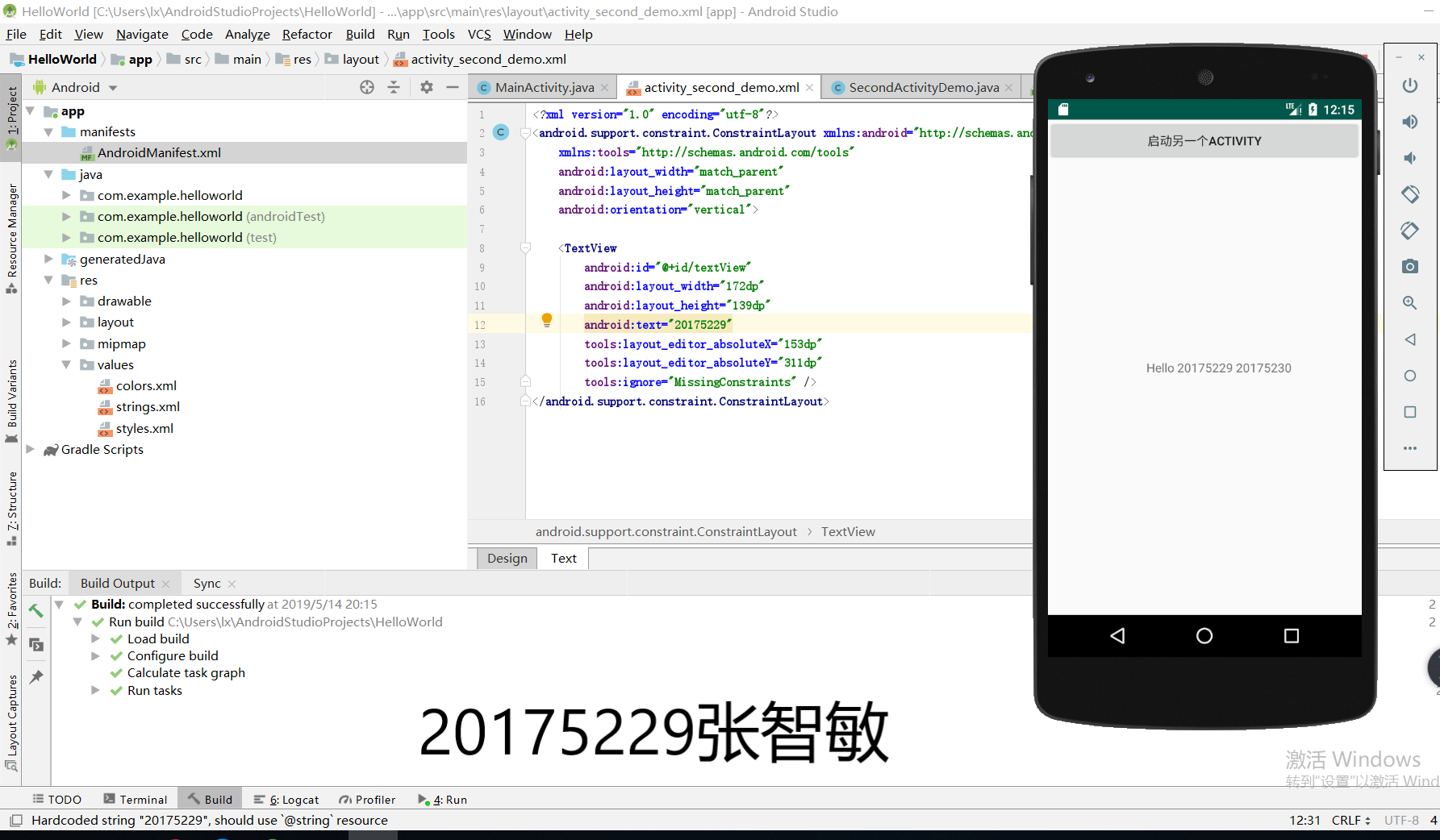 #二、实验四 Android程序设计-2 1.实验要求: Activity测试: 参考《Java和Android开发学习指南(第二版)(EPUBIT,Java for Android 2nd)》第二十五章: (1)构建项目,运行教材相关代码; (2)创建 ThirdActivity, 在ThirdActivity中显示自己的学号,修改代码让MainActivity启动ThirdActivity; (3)提交代码运行截图和码云Git链接,截图要有学号水印,否则会扣分。