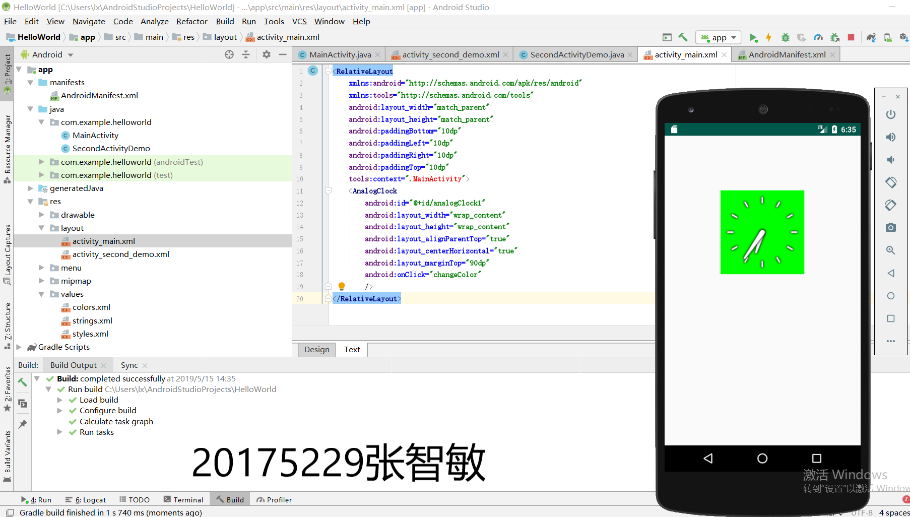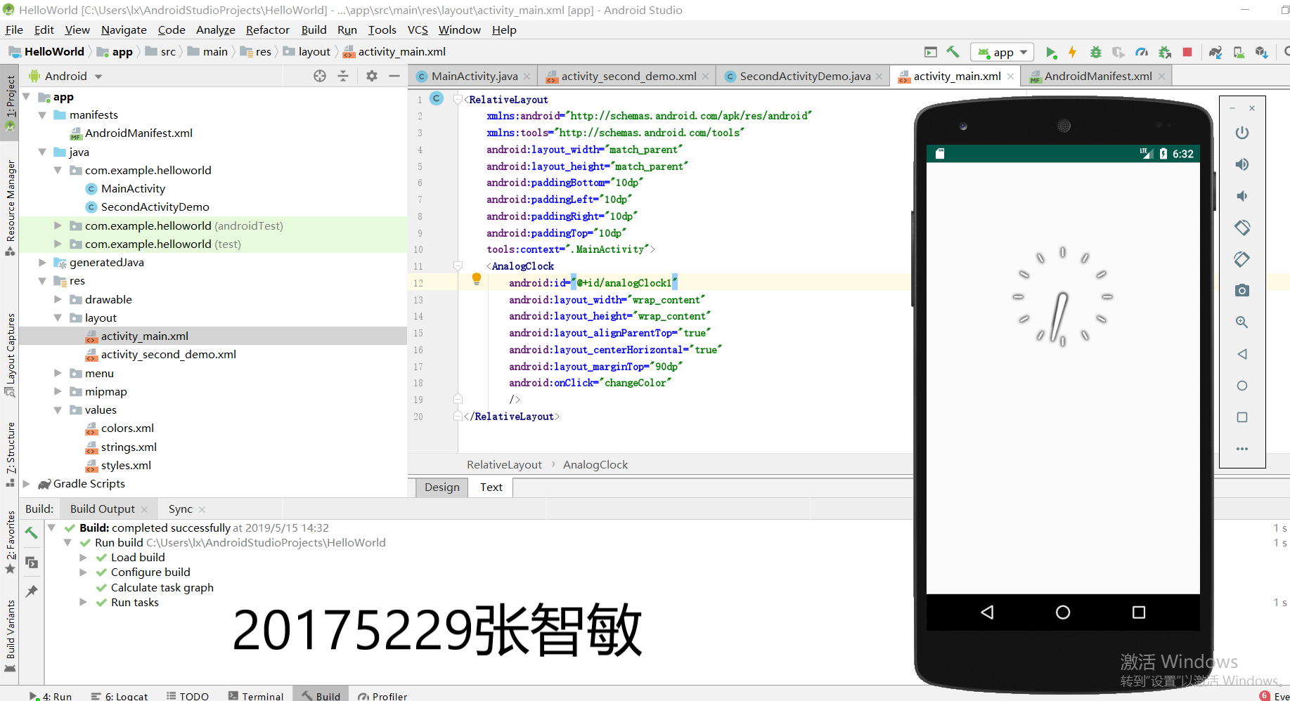 2.实验过程: 注:功能描述------在点击屏幕后,时钟背景颜色发生改变; (1)改写MainActivity下的代码如下: