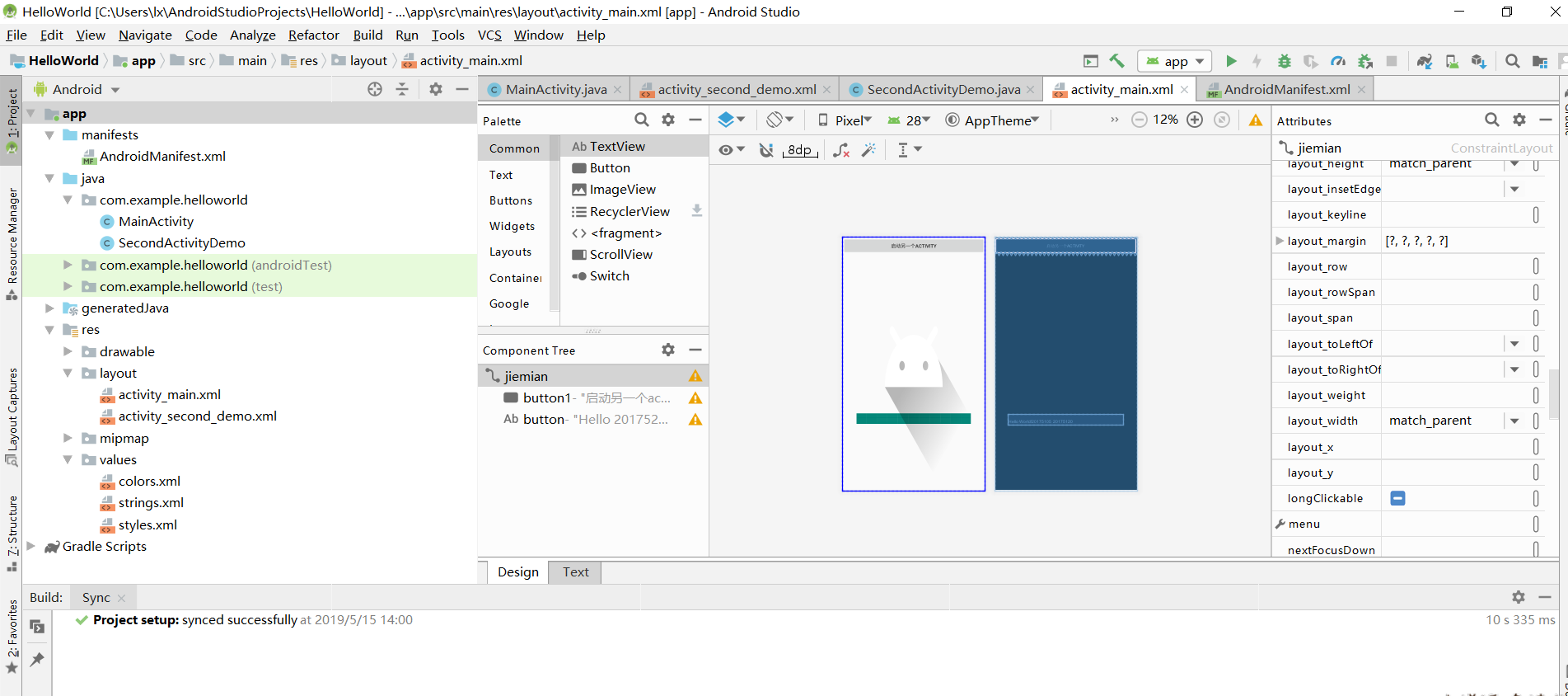 (3)项目的编译和运行 因为HelloWorld在项目中是自带的,修改res中的layout中的activity_main.xml的代码即可。 修改后的activity_main.xml的代码: